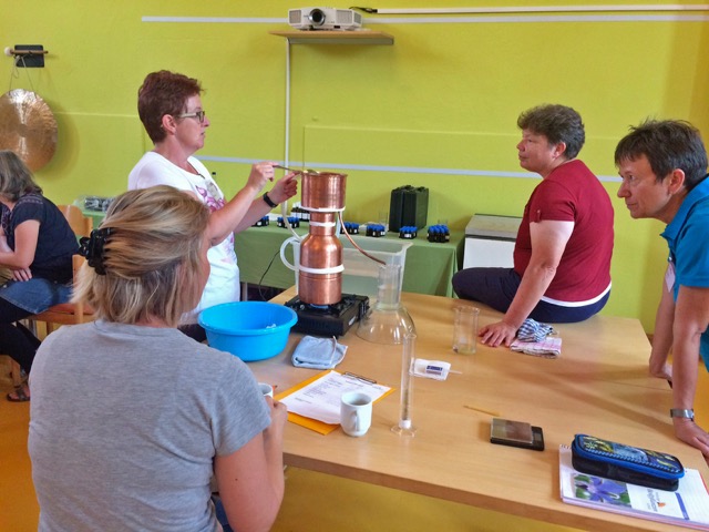Jede Gruppe wird dann nacheinander mit den unterschiedlichsten Destillen arbeiten. So findet jeder Teilnehmer die für ihn am besten geeignete Destillenform zur Herstellung seiner eigenen Pflanzenwässer!