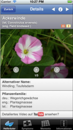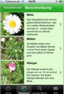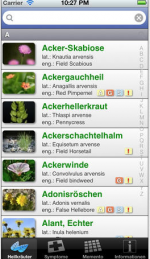 Mit dieser App kann eine Auswahl der schönsten Wild- und Heilkräuter anhand der Blütenfarbe bestimmt werden. Neben dem Namen der Pflanze läßt sich zudem Interessantes über Botanik, Wildkräuterküche und Naturheilkunde nachschauen. Für jede der momentan 55 Pflanzen sind mehrere Fotos verfügbar, so dass viele Details zu erkennen sind. Mit der erweiterten Suchfunktion können der Name einer Pflanze, ihr Bild und alle weiteren Angaben leicht gefunden werden.