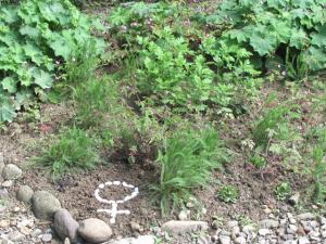 Die kleinen Pflänzchen wurden gezogen und umgetopft oder dazugekauft – einige Pflanzenvertreter hatten sich schon im „richtigen“ Beet angesiedelt, so beispielsweise die Brennessel im Mars-Beet oder der Frauenmantel im Venus-Beet. Und so waren die einzelnen Beete bald vorbereitet (Bild oben links). Nun brauchte es nur noch wärmende Sonnenstrahlen und ein paar Regengüsse, damit die Pflänzchen mit dem Wachsen loslegen konnten. Und nicht zu vergessen immer wieder fleißige Hände, um die Schnecken aus dem Beet fern zu halten. Zur leichteren Erkennung wurden die einzelnen Beetsegmente mit den zugehörigen Planetenzeichen aus weißen Kieselsteinen gekennzeichnet (Bild oben rechts, Venus). Welch großen Spaß machte es, bis all die Zeichen in richtiger Form und gleicher Größe gelegt waren!