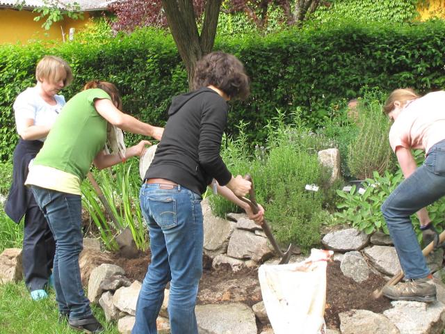 Zum praktischen Teil gehörte unter anderem auch die schon länger geplante Erweiterung der Kräuterspirale und die Neuanlage des Teiches. Natürlich war es nicht möglich, all dies in den zwei Seminartagen zu Ende zu bringen, aber die Basis wurde bei Sonnenschein mit viel Muskelkraft gelegt.