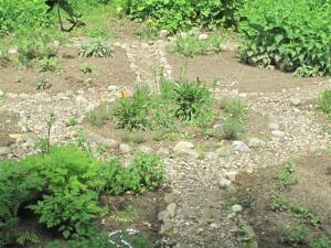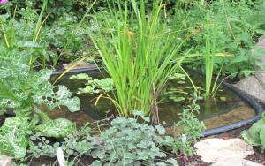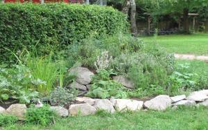 Mit noch etwas Nacharbeiten und Besorgen weiterer Heilpflanzen, die bis jetzt noch im Garten gefehlt haben, kann die Kräuterspiralenerweiterung nun als neue Augenweide alle Besucher erfreuen. Die löchrig gewordene Teichfolie haben wir durch ein Teichbecken mit Uferzone ersetzt und mit speziellen Wasserpflanzen bestückt, damit das stehende Wasser klar bleibt und nicht schlecht wird. Sogar ein Winter-Schachtelhalm (Equisetum hyemale) hat darin seinen Platz gefunden. Im nächsten Frühjahr werden dann in der Uferzone noch Mädesüß und Pestwurz dazu kommen. Aber schon jetzt blüht und gedeiht ganz vieles um den Teich herum: da finden sich einige Mariendisteln, im Schatten Duftveilchen, dann die beiden südafrikanischen Kapland-Pelargonien („Umckaloabo“), eine Zistrose (Cistus incanus ssp. tauricus), ein täglich noch höher wachsender Muskatellersalbei und dann in der Kräuterspirale die Eberraute, der Andorn, die Indianernessel mit ihrem roten Schopf und viele verschiedene, herrlich duftende Thymiansorten.
